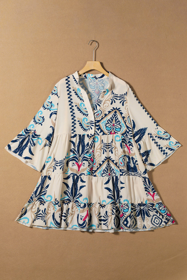 White Printed Tribal Bracelet Sleeve Buttoned Mini Dress
