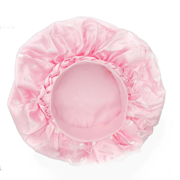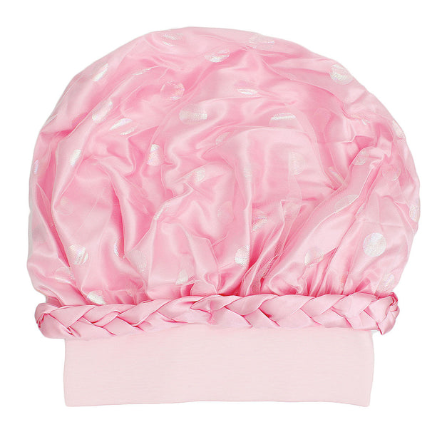 Bonnet de nuit pour femme. Bonnet de nuit en satin soyeux rose clair à larges bords, avec tulle à pois et bande tressée. Grande taille pour cheveux épais ou longs. Large bande extensible confortable au toucher coton. 6,3 cm. Le bonnet mesure 35,6 cm de long avec la bande à plat. Taille unique.