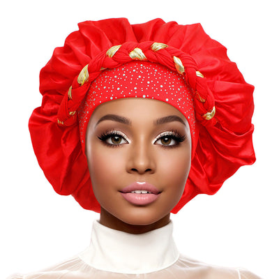 Bonnet soyeux à imprimé tribal africain rouge, jaune, bleu et noir pour dreadlocks et tresses. Coupe confortable avec bords élastiques. Grande capacité pour cheveux longs. Convient aussi bien aux hommes qu'aux femmes. Le bonnet mesure 55 cm de long à plat. 100 % polyester.