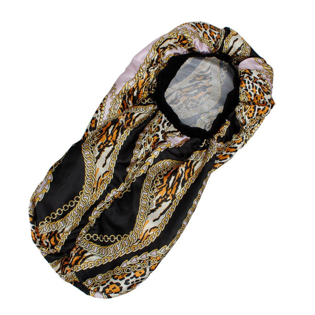 Bonnet soyeux rose et noir à imprimé léopard pour dreadlocks et tresses. Coupe confortable avec bords élastiques. Grande capacité pour cheveux longs. Convient aussi bien aux hommes qu'aux femmes. Le bonnet mesure 55 cm de long à plat. 100 % polyester.