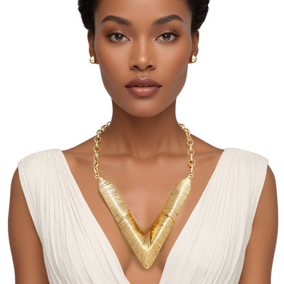 Women's Bib Necklace Set. Gold Metal Oval Link Chain Necklace Featuring Geometric Large Wire Wrapped V Shaped Bib Pendant. V Pendant measures 5" x 5.25" and 1" tall. Lobster Clasp Closure. Includes Matching Ball Stud Post Backing Earrings. **Product is Handmade. Please Allow for Variations in Wire Wrapped Design.