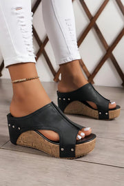 Black Hollow Out Studded PU Leather Wedge Slippers