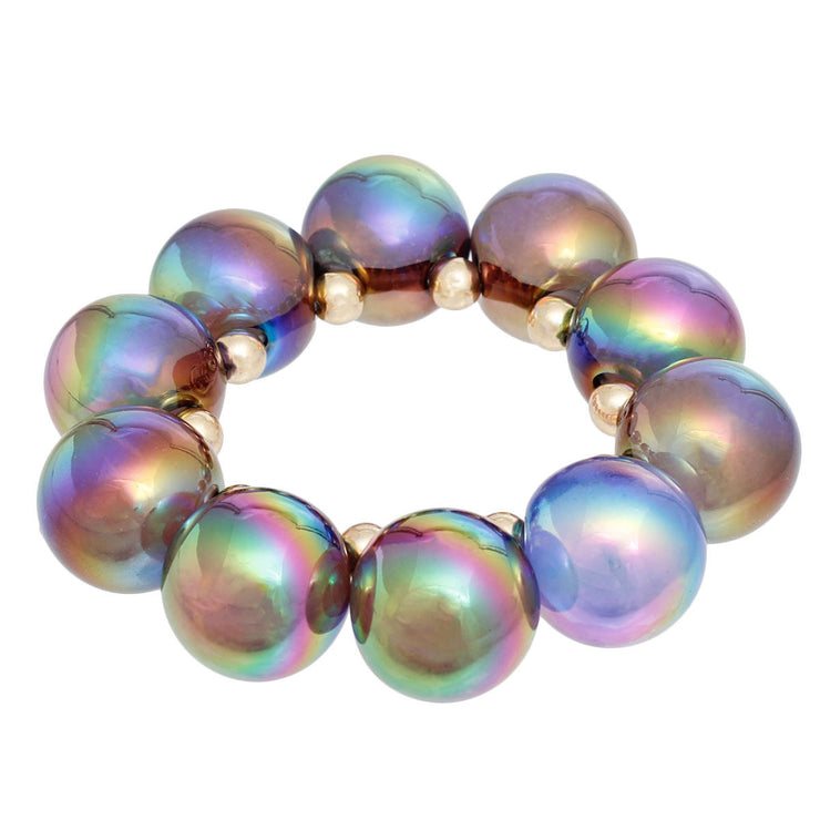 Women's Beaded Bracelet. Black Rainbow Iridescent Bubble Ball Acrylic Beaded Stretch Bracelet Featuring Gold Metal Spacers and Floating Cluster Design. Stretch to Fit Elastic.