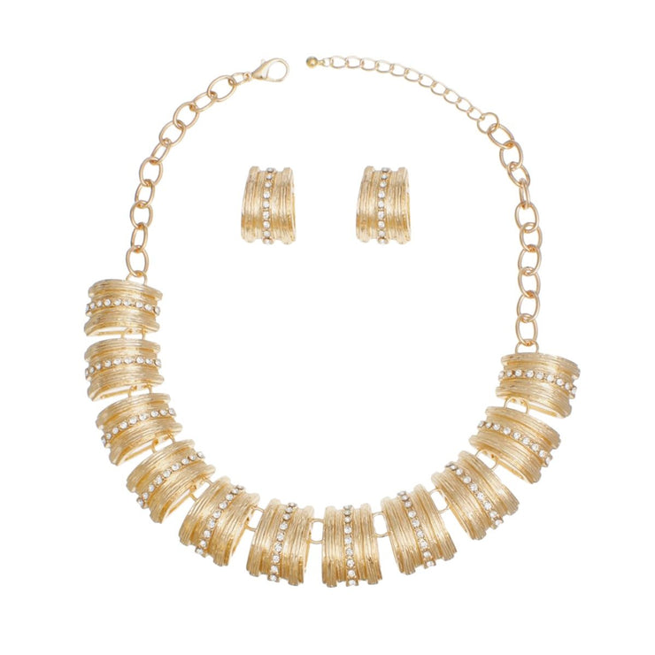 Women's Chain Collar Necklace Set. Dramatic Gold Metal Oval Link Necklace with Curved Bridge Shaped Metal Links Collar Featuring Scratched Texture and Clear Rhinestone Detailing. Each Curved Link Measures 1.25" x 1" and .4" tall. Lobster Clasp Closure. Includes Matching Curved Link Stud Post Backing Earrings.