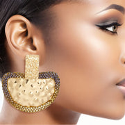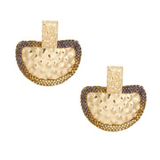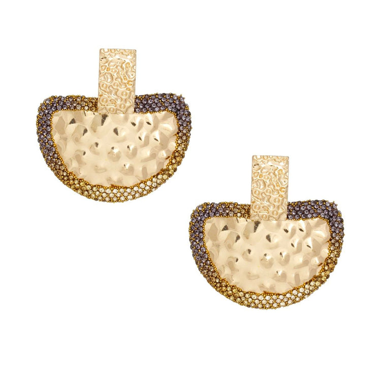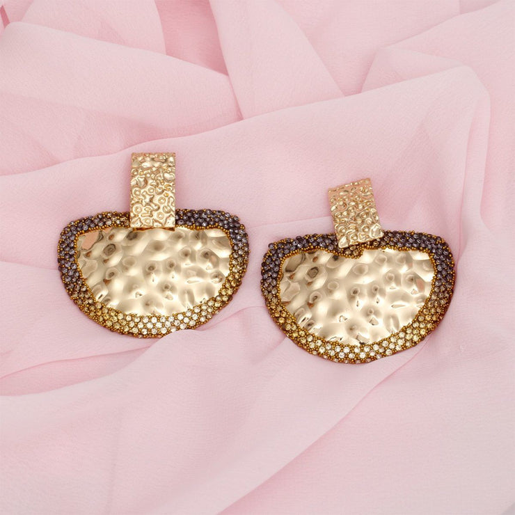 Women's Drop Earrings. Bold Rectangular Gold Melted Metal Texture Earrings Featuring Drop Semicircle Detail Comprised of Bubbled Texture Metal Edged with Ombre Brown Rhinestone Detailing. Post Backing.