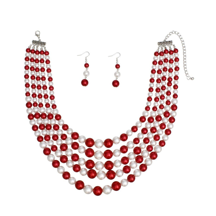 Delta Sigma Theta Sorority Paraphernalia Women's Multi Strand Pearl Necklace Set. Alternating Red and White Acrylic Pearls 5 Strand Graduated Layer Necklace Set. Necklace measures approximately 3" wide. Silver Metal Lobster Clasp Closure. Elegant Engraved Metal Strand Separator at Neckline. Includes Matching Triple Pearl Drop Fish Hook Earrings.