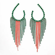 Women's Long Fringe Earrings. Silver Metal with Green Rhinestones Horseshoe Shaped Earrings Featuring Long Red and Green Rhinestone Drop Fringe Tassel. Post Backing.