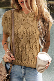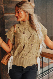 Light French Beige Hollowed Knit Scalloped Trim High Neck Sweater
