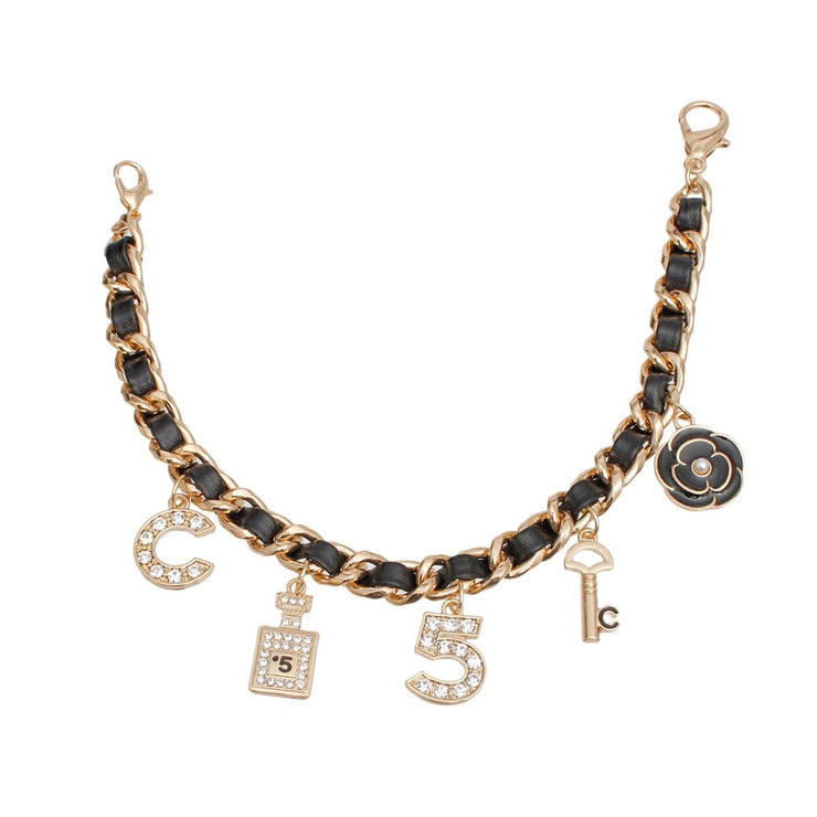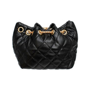Women's Mini Bucket Handbag. Black Quilted Vegan Faux Leather Bag Featuring Woven Gold Metal Chain Detail with Lux Parisian Boutique Charms Including: C, Perfume Bottle, 5, Key, and Black Epoxy Camellia Flower . Drawstring Style Push Chain Lock with Pearls. Charm Chain Handle is Detachable and Can be Worn attached to Belt Loops or Other Belt as a Drape Chain. Chain measures 9.5" long. Also Includes Long Metal Shoulder Chain.
