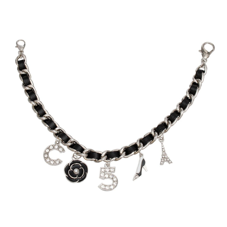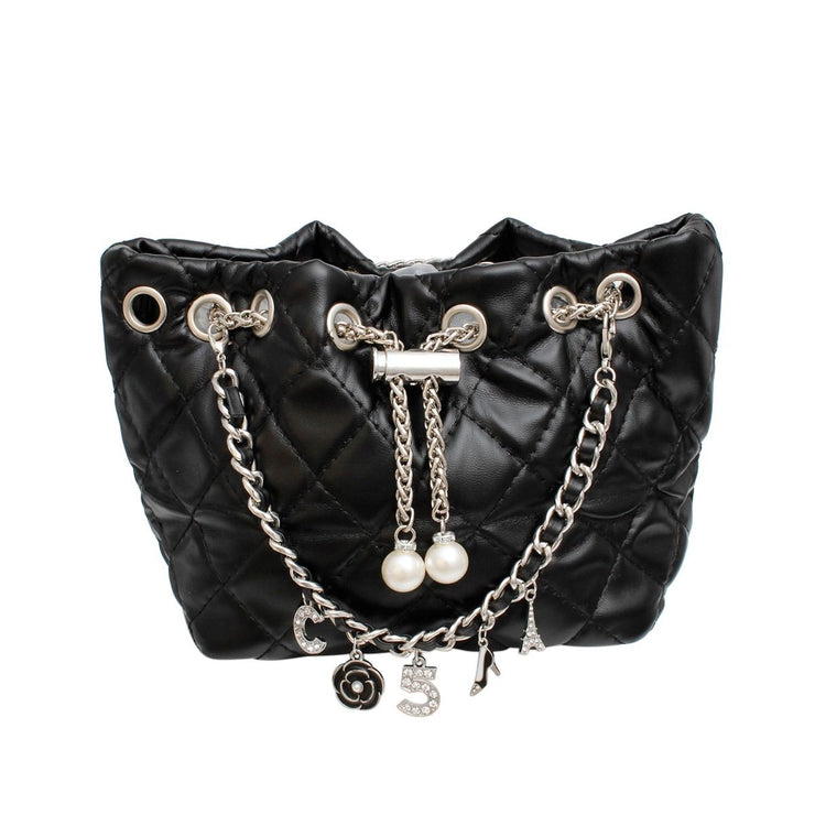 Women's Mini Bucket Handbag. Black Quilted Vegan Faux Leather Bag Featuring Woven Silver Metal Chain Detail with Lux Parisian Boutique Charms Including: C, High Heel, 5, Eiffel Tower, and Black Epoxy Camellia Flower . Drawstring Style Push Chain Lock with Pearls. Charm Chain Handle is Detachable and Can be Worn attached to Belt Loops or Other Belt as a Drape Chain. Chain measures 9.5" long. Also Includes Long Metal Shoulder Chain.