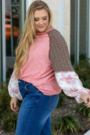 Pink Checkered Paisley Patchwork Raglan Sleeve Seamed Plus Size Top