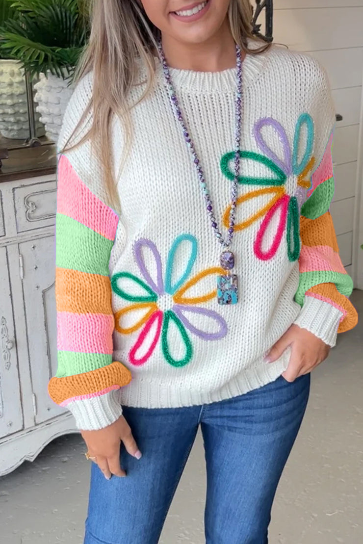 White Flower Graphic Colorblock Sleeve Crew Neck Sweater