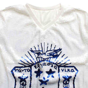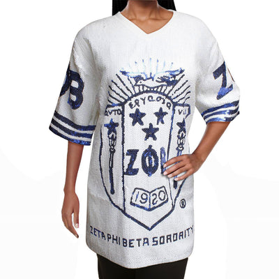 ZPB Sorority Paraphernalia White Sequin Jersey Shirt Featuring Blue ZPB Shield and Blue Zeta Phi Beta Greek Letters on Sleeves with Blue Stripe Details. Back says FINEST 20. White Interior Lining. 100% Polyester. One Size. Shirt measures 30" from shoulder to bottom hem. 23" wide when laid flat. 12" Sleeve length. Washing Instructions: Turn jersey inside out. Hand wash in cold water with a mild detergent. Hang Dry.